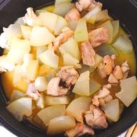 - 6 2と4を入れて中火で10分程炒めます。冬瓜が柔らかくなり、鶏もも肉に火が通ったら1の半月切りを入れてさっと炒め、火から下ろします。