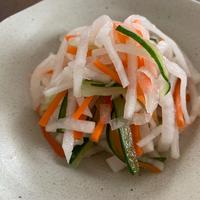 大根とにんじんで作る紅白なますに、もう1色きゅうりをプラスすることで、彩りも鮮やかに!サクッと作れるので、あと一品欲しい時にとっても便利。甘めに仕上げれば、野菜嫌いのお子さんも気に入ってくれるかも!?ぜひお作り下さいね。