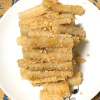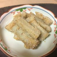 - 1 ゴボウは皮をこそぎ、麺棒で叩いて崩し、5cmくらいの長さに切ります。