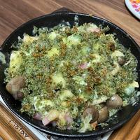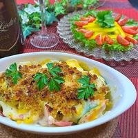 - 4 耐熱皿に1を敷き詰め、ブルーチーズをちぎってのせ、ピザ用チーズ、3をかけます。オーブントースターで8分、パン粉がこんがりとするぐらい焼いたら完成です。