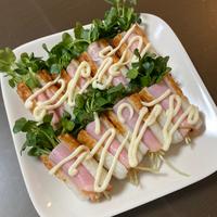 - 3 中にハムを詰めて、さらにかいわれも詰めます