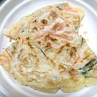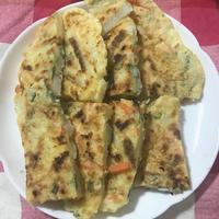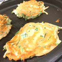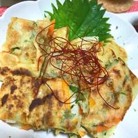 大葉がきいて美味しかったです。2回目はキムチなど入れました。ジャガイモを擦って生地にいれるとモチモチでした!米粉も少し使いました。