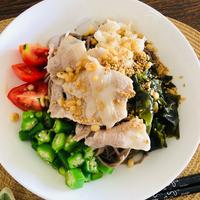 豚バラ、トマト、オクラ、ワカメ、大根おろし、天かすをトッピングしました
