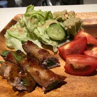 - 3 豚バラ肉に1を3本ずつ斜めにのせてらせん状に巻きます。