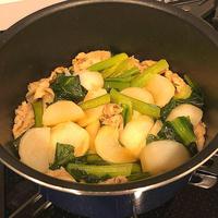 肉じゃがみたいな味とのことだったので小松菜を入れるのどうかなと思いましたが、カブの風味が増してめちゃくちゃ美味しくできました!