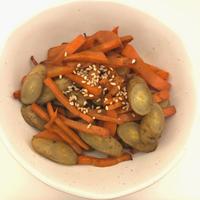 - 5 にんじんがしんなりしてきたら、3を入れて強火でサッと炒めて全体に馴染んだらお皿に盛り、白いりごまを散らして完成です。