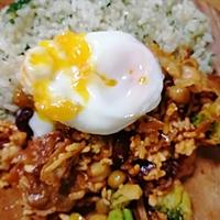 スパイシーな味わいのお肉と豆を使ったメキシコ料理のチリコンカンに、黒こしょうの風味が合わさった、彩り豊かな一品です。ケチャップの甘みとスパイスを使うことで、味に深みが出ます。温泉卵と一緒に食べると辛みがマイルドになってまた違った美味しさです。