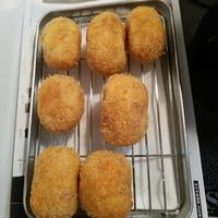 - 6 鍋に底から5cm程揚げ油を注ぎ、170℃に熱し、5を入れてきつね色になるまで5分程揚げ、油を切ります。