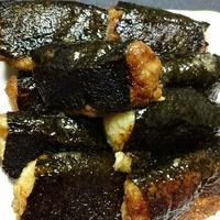 - 3 焼きのりを8等分に切り、2を塗りつけるように付けて半分にたたみます。