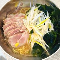 パパ👨ご飯✨チャーシューは、手作り‼️鳴門生わかめ使用。ねぎは、ごま油と、味の素で🍜市販の麺&スープを使用✨かいざん風に💓シンプルで、美味しかった‼️