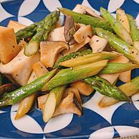 - 4 アスパラガスに火が通ってきたら、(B)を加えて中火で炒め合わせます。全体に味がなじんだら火から下ろします。