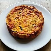 - 8 生地の敷かれた型に2のほうれん草を並べ、3の具と卵、牛乳、塩こしょうを混ぜ合わせた生地を流し込み、かぼちゃ、プチトマトを並べます。