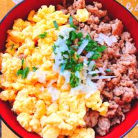 炒り卵を添えて、そぼろ丼にしましたー♡