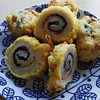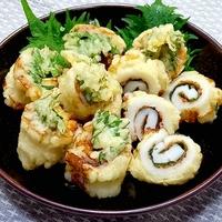 ちくわの内側に切れ目を入れる事で巻きやすくしています。 梅肉はワサビや柚子胡椒に、青ジソはバジルに代えて頂いても美味しくお召し上がり頂けます。 天ぷら粉は濃度の薄いサラッとしたものを薄く衣にすると、サクサクの軽い食感に仕上がります。