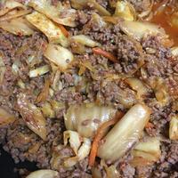 しいたけ4つをひき肉5割くらい火が通ったところで追加。ひき肉から油が出るのでごま油はなし。ちょうど良い濃さで美味しい!