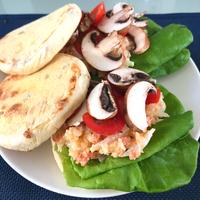 フリルレタスの代わりにサラダ菜を使い、マフィンは1枚だけ両面焼きました。玉ねぎも念のためレンチンしました。