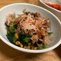 簡単に鉄分とタンパク質が取れて良いかなぁと!ゴマ油は多目、納豆付属のタレにプラス白だしくらいがご飯のおかずにはちょうどいいかも…