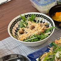 - 準備 水菜は根元を切り落としておきます。キュウリはヘタを切り落としておきます。しめじとえのきは石づきを落としておきます。ツナ油漬けは、油を切っておきます。