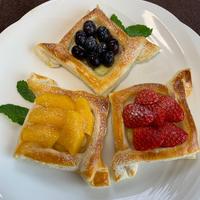 カスタードクリームの代わりに生クリームを使用する場合は、パイ生地のみを焼いてからのせてくださいね。パイ生地が浮き上がりやすくなりますので、生クリームを絞る際には中心を軽く潰すように押さえることをおすすめします。素敵に仕上がりますように。