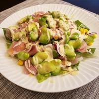 生ハムとそら豆のフレッシュサラダのご紹介です。サラダにそら豆を加える事で、いつもと違う雰囲気のサラダになります。そら豆は電子レンジで加熱するだけなので手軽に使えますよ。ドレッシングはマヨネーズベースの味付けでコクもあるのでおいしくいただけます。