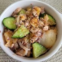 紫玉ねぎを使ったので水にさらさずに使用しました。きゅうりを1本使ったのでごま油、醤油を気持ち増やしました。青魚が苦手な母もキムチで魚臭さが消えたおかげで食べてくれました🤗お酒のアテにも良いですね🎵
