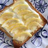 カリッと焼いた食パンにヨーグルトをたっぷり塗り、薄くスライスしたレモンをのせた爽やかな一品です。レモンは薄切りにするのがコツで、厚いと酸味と苦みが強くなってしまいます。トースト全体に染み込んだヨーグルトはトロッとした食感が楽しく、はちみつの優しい甘みとレモンの清々しい酸味が絶妙なハーモニーを奏でます。朝食にぴったりの上品な一皿です。