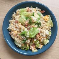 たっぷりレタスのシャキシャキ感と、ガーリックやバター醤油の香りがとても合う炒飯です。ベーコンと卵も加えて旨みたっぷりのひと品です。忙しい時のランチや、ちょっと小腹が空いたときにぜひ作ってみてくださいね。