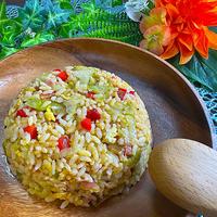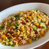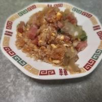 赤パプリカ無しでスライスハムとチューブのニンニク代用。ミックスベジタブル追加。美味しい♪