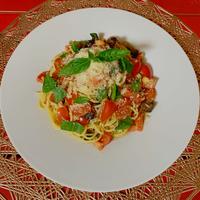 切った材料と調味料を和えるだけでソースは出来上がるし、パスタも茹で上がったものをソースと和えるだけ。めっちゃ簡単で美味しい。