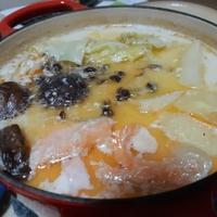 鮭、焼き豆腐、じゃがいも、白菜、ねぎ、えのき茸、バターで