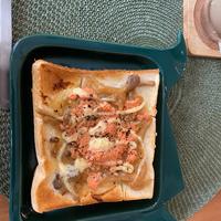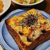 あつあつのグラタンをのせた、ちょっと豪華なトーストレシピです。しょうゆで味を付け、和風に仕上げたクリーミーなグラタンが、明太子とよく合いますよ。食べごたえ抜群で、お腹も大満足です。ぜひ、作ってみてくださいね。