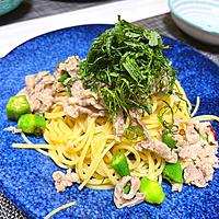 - 4 パスタが茹で上がったら、具を入れ、オリーブオイル、紫蘇を掛けて出来上がりです。