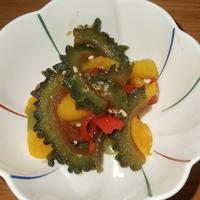 - 1 ゴーヤは薄切りにします。赤パプリカは薄切りにします。黄パプリカは薄切りにします。