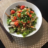- 4 器に素麺を盛り、食べやすい大きさに切った水菜、ミニトマト、2の野菜と豚肉を盛りつけます。