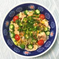 - 2 お湯を沸かし、ニンジンと玉ネギを軽く湯通しします。同じ湯でオクラと豚肉も茹で、アクを除いて素麺を茹でて冷水にとります。