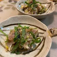 アジはお刺身用にスライスされたものを使用しましたが、同量のサクでもお作りいただけます。骨がある場合は取り除いてお使いください。 島らっきょうの葉の部分を白ねぎに変えていただいてもおいしくお作りいただけます。