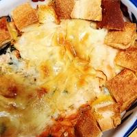 - 8 焼き型に敷いた食パンの中に7を注ぎ入れて、とろけるチーズをトッピングし、オーブントースターで約15分こんがりと焼き色がつくまで焼きます。