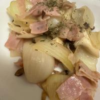- 4 中火で熱したフライパンに有塩バターを入れ、溶けたら1、2、3を入れて炒めます。玉ねぎがしんなりしてきたら(A)を入れ全体に味がなじんだら火から下ろします。