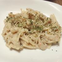 レンジで手軽に作れるので助かります!えのきがシャキシャキでマヨポンたらこが絡んで美味しい、バジルが無い代わりにあおさを散らしました。