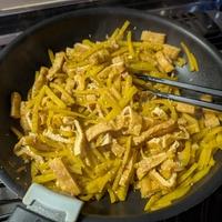 定期で頼んでいる野菜セットにオレンジのビーツが入っていたので、検索して作りました。皮を剥いたら黄色でした。鷹の爪が無かったのと、辛いのが苦手なので、七味唐辛子を代用して、油揚げを増量しました。またビーツが手に入ったら作ってみます。