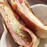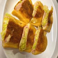 - 3 ハム2枚、千切りキャベツ、1の順に入れ、爪楊枝で留めます。