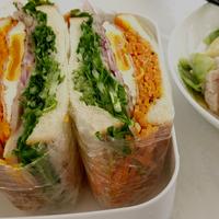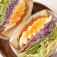 贅沢山盛りサンドイッチはいかがでしょうか。彩りの野菜とロースハム、目玉焼きを挟んだサンドイッチです。ボリューム満点なので、食べ応えがありますよ。お好みの具材でアレンジも楽しめます。ぜひお試しくださいね。