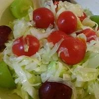 いつもだと和風か中華風にしてしまうので イタリアン風は新鮮でした。あっさりしていて美味しかったです。 キャベツは太めの千切りにして、少しだけレンジで火を通しました。子どもも食べるので黒こしょうは少なめで、ブドウも乗せてみました。