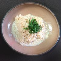 - 4 4を器に盛り、1、たらこ、クリームチーズを上に盛り付けたら完成です。