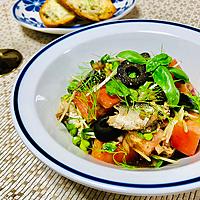 バルサミコ酢が食欲をそそる、オイルサーディン大好きな私にとってはメインディッシュ級のサラダです。ブラックオリーブが欠かせません。