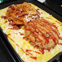 みんなでワイワイ。美味しいし楽しいし🎵オムライス&ナポリタンon鉄板卵フワフワ、チーズとろーり最高😊😊😊😊😊