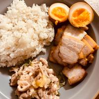 - 4 炊飯が終わったら豚バラ肉を5mm幅に切ります。お皿に盛り付け、2を添えて完成です。
