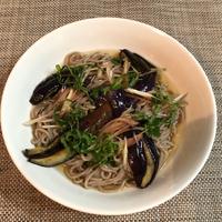 揚げナスとたっぷりの薬味で食べる冷たいぶっかけそばです。さっぱりしたそばに揚げナスのコクが加わって、食べごたえがありますよ。ナスは少ない油で揚げ焼きにしましたが、焼きナスでも電子レンジ加熱でも違った美味しさが味わえます。ぜひお試しくださいね。