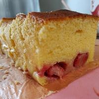 2回目です。1回目は丸型で焼いて30分で焼けましたが、今回はパウンド型でプラス20分焼きました。焼き始め30分で焦げ始めたのでアルミホイルかぶせて焼きました。生地は甘いですがイチゴ残した酸味で丁度いいです❗