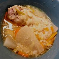 大根多め、水400ml、鶏ガラ大さじ1.手羽元7本、米大さじ4で私好みの薄味になりました。あとはそれぞれの好みで塩で調整してもらいました。